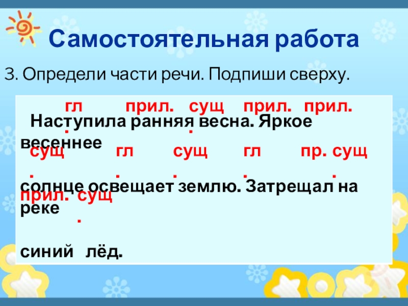 Самостоятельная работа3. Определи части речи. Подпиши сверху. прил.гл.гл.сущ.гл.прил.прил.прил.пр.сущ.сущ.сущ.сущ.