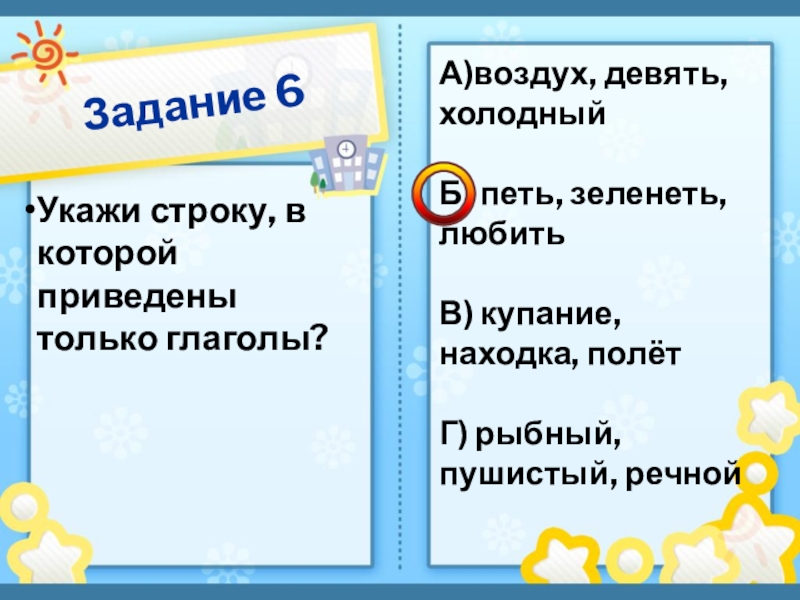 Задание 6Укажи строку, в которой приведены только глаголы?А)воздух, девять, холодныйБ) петь, зеленеть, любитьВ) купание, находка, полётГ) рыбный,