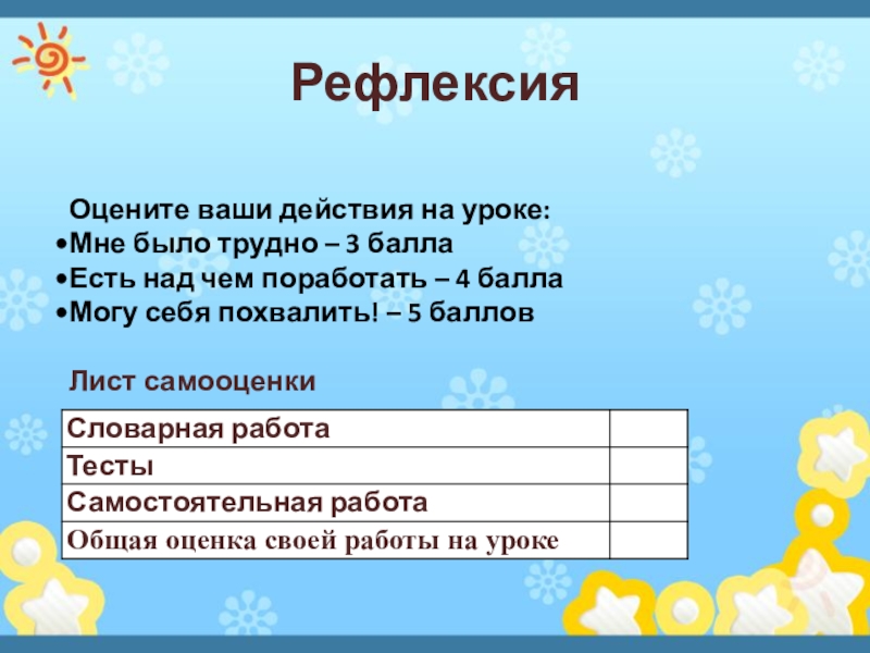 РефлексияОцените ваши действия на уроке:Мне было трудно – 3 баллаЕсть над чем поработать – 4 баллаМогу себя