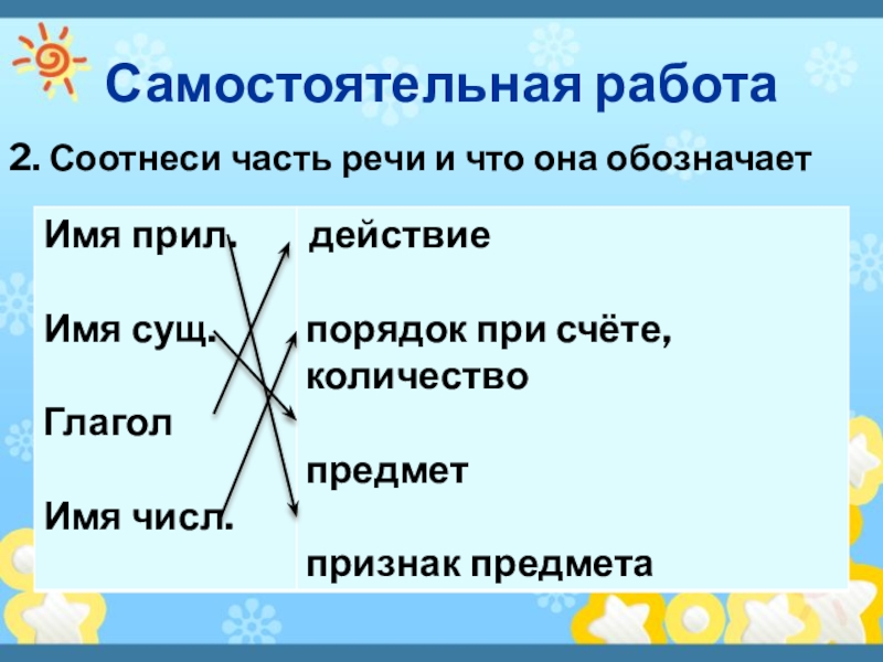 Самостоятельная работа2. Соотнеси часть речи и что она обозначает