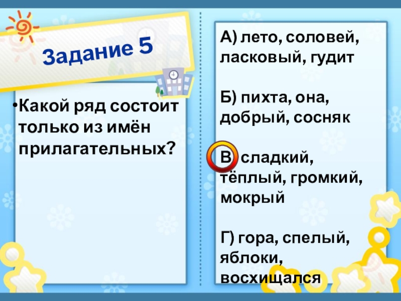 Задание 5Какой ряд состоит только из имён прилагательных?А) лето, соловей, ласковый, гудитБ) пихта, она, добрый, соснякВ) сладкий,