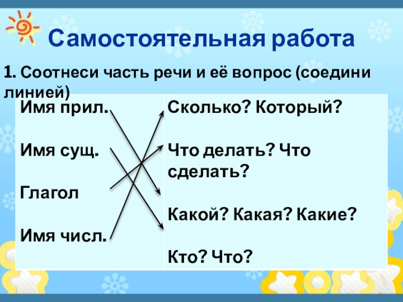 Самостоятельная работа1. Соотнеси часть речи и её вопрос (соедини линией)