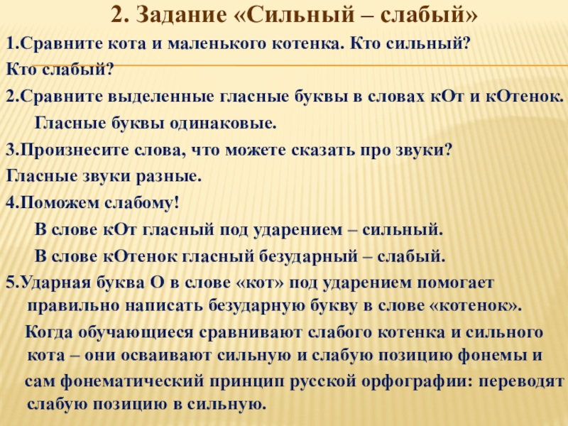 Когда обучающиеся сравнивают слабого котенка и сильного кота – они осваивают сильную и слабую позицию фонемы и