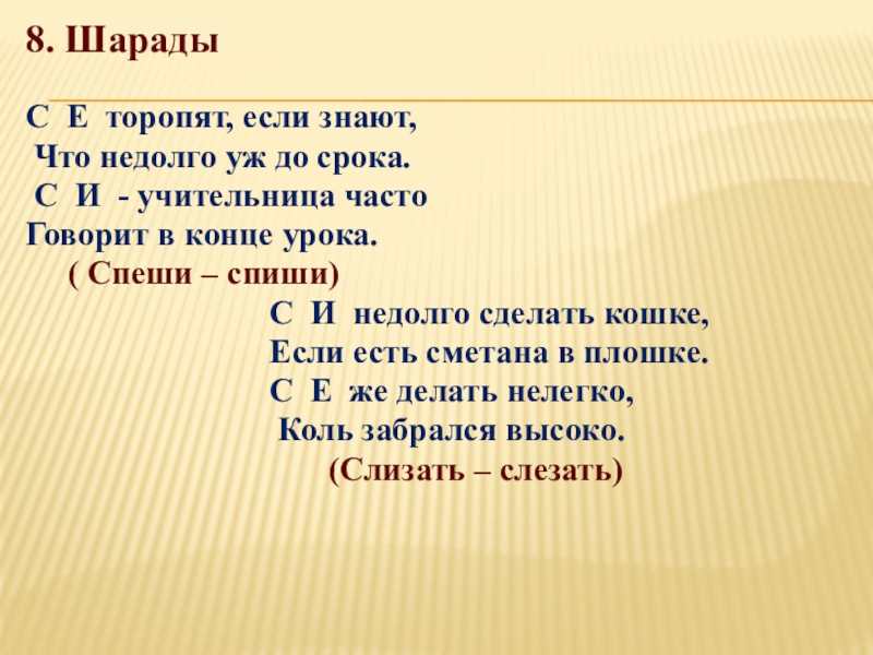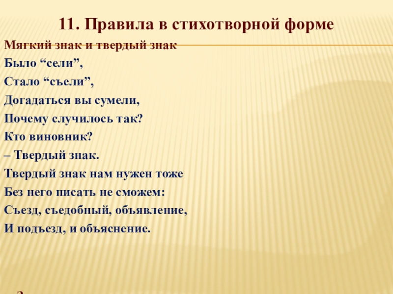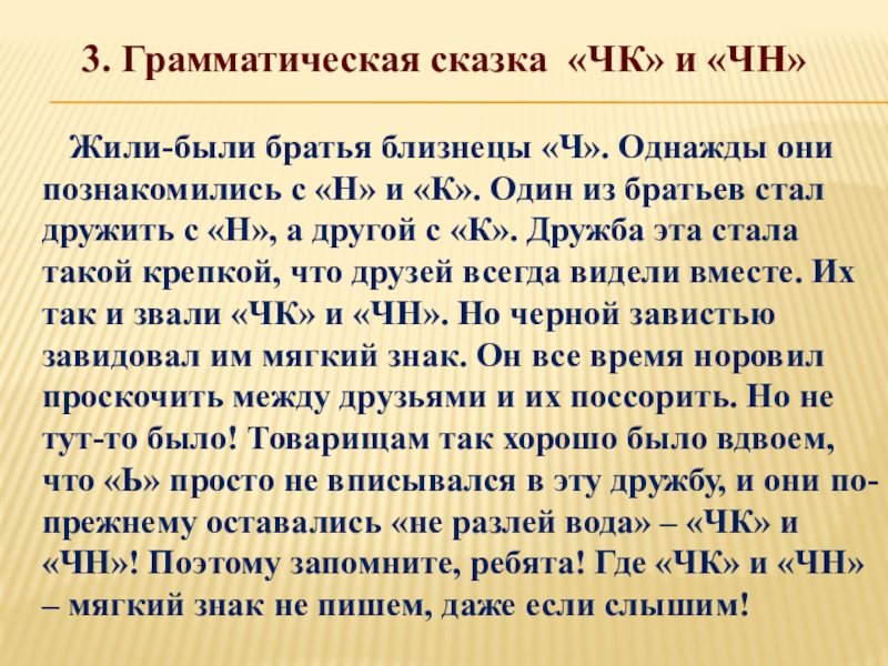 близнецы «Ч». Однажды они познакомились с «Н» и «К». Один из братьев стал дружить с «Н», а другой с «К». Дружба эта стала такой крепкой, что друзей всегда видели вместе. Их так и звали «ЧК» и «ЧН». Но черной завистью завидовал им мягкий знак. Он все время норовил проскочить между друзьями и их поссорить. Но не тут-то было! Товарищам так хорошо было вдвоем, что «Ь» просто не вписывался в эту дружбу, и они по-прежнему оставались «не разлей вода» – «ЧК» и «ЧН»! Поэтому запомните, ребята! Где «ЧК» и «ЧН» – мягкий знак не пишем, даже если слышим!