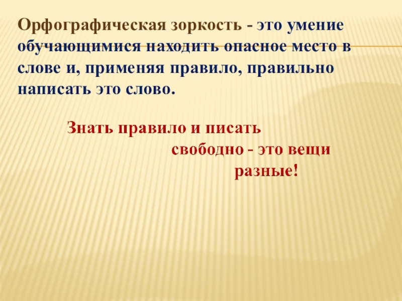 Слайд 5Орфографическая зоркость - это умение обучающимися находить опасное место в слове