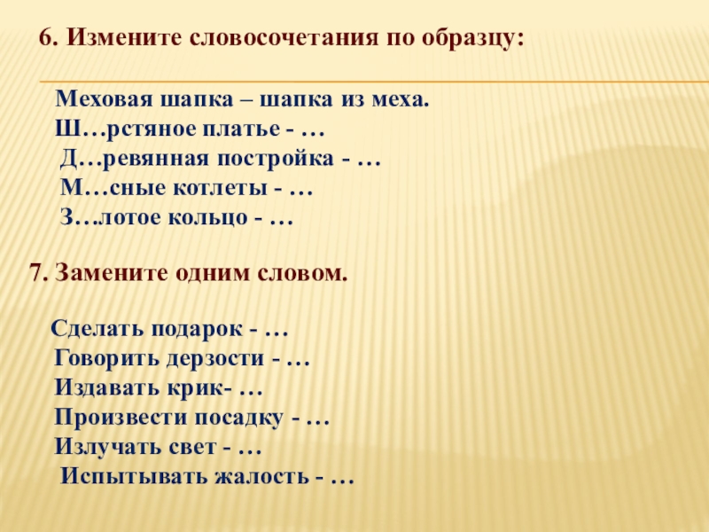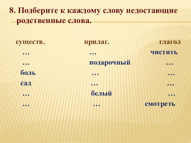Слайд 158. Подберите к каждому слову недостающие родственные слова.