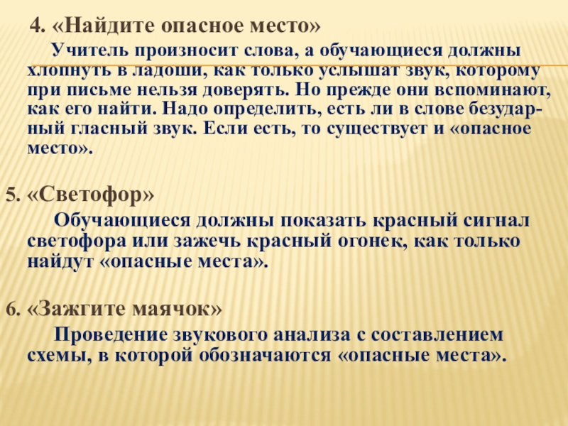 произносит слова, а обучающиеся должны хлопнуть в ладоши, как только услышат звук, которому при письме нельзя доверять. Но прежде они вспоминают, как его найти. Надо определить, есть ли в слове безудар-ный гласный звук. Если есть, то существует и «опасное место».