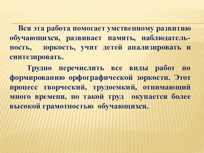 Трудно перечислить все виды работ по формированию орфографической зоркости. Этот процесс творческий, трудоемкий, отнимающий много времени, но такой труд окупается более высокой грамотностью обучающихся.