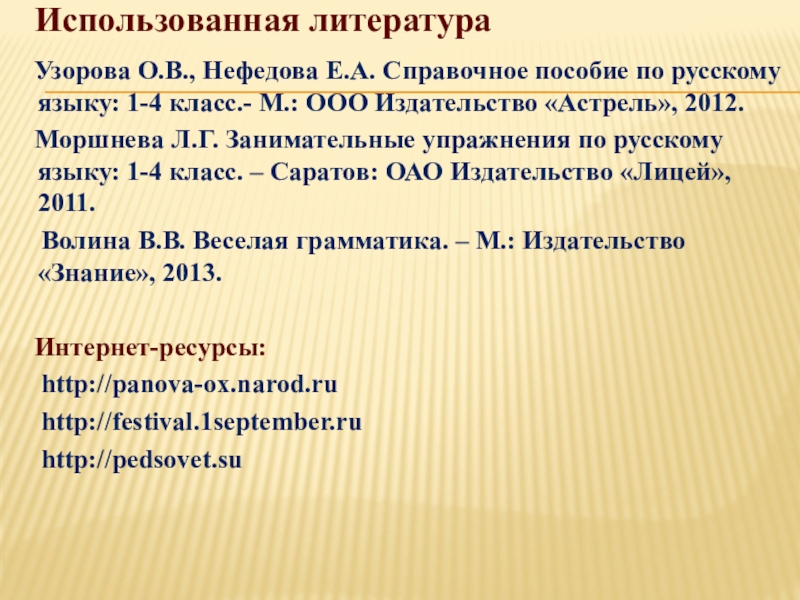 Моршнева Л.Г. Занимательные упражнения по русскому языку: 1-4 класс. – Саратов: ОАО Издательство «Лицей», 2011.