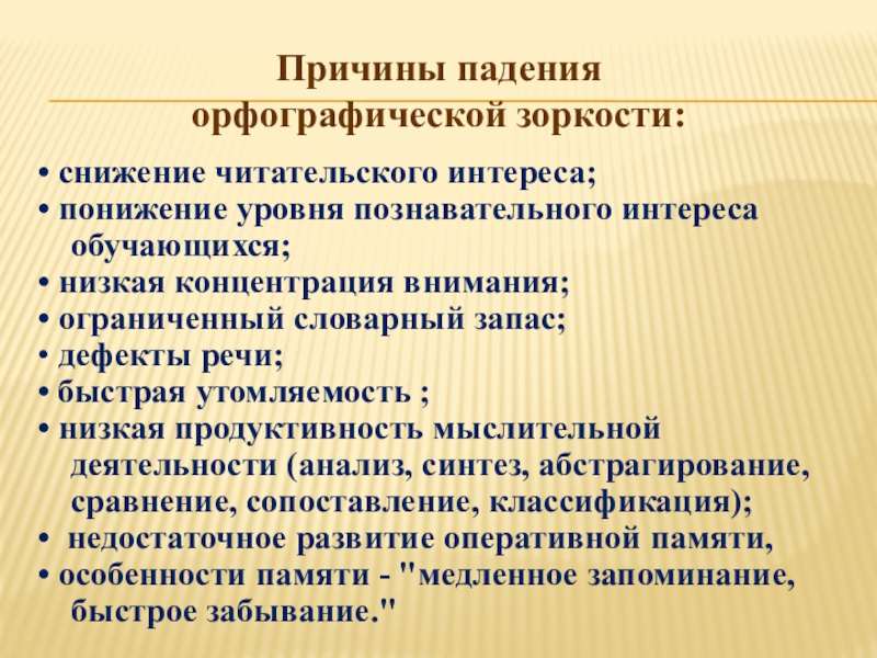• низкая продуктивность мыслительной деятельности (анализ, синтез, абстрагирование, сравнение, сопоставление, классификация);