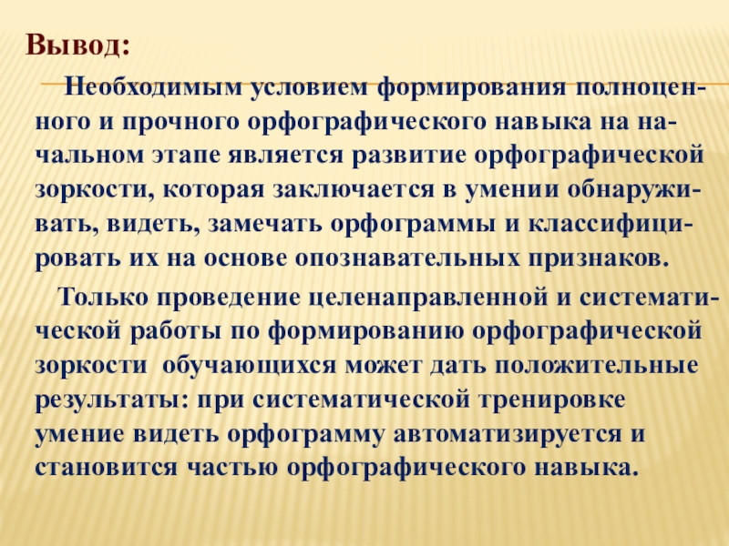 Только проведение целенаправленной и системати-ческой работы по формированию орфографической зоркости обучающихся может дать положительные результаты: при систематической тренировке умение видеть орфограмму автоматизируется и становится частью орфографического навыка.