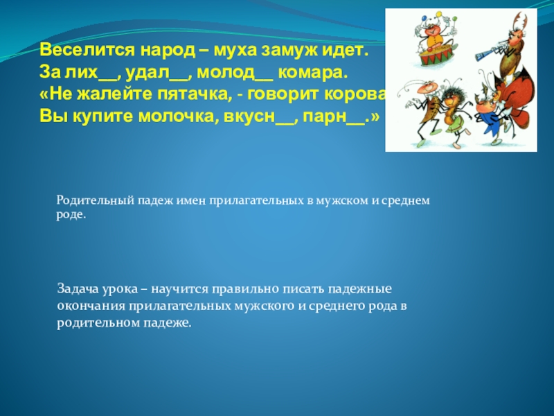 Задача урока – научится правильно писать падежные окончания прилагательных мужского и среднего рода в родительном падеже.