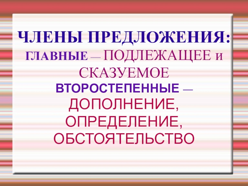 ЧЛЕНЫ ПРЕДЛОЖЕНИЯ: ГЛАВНЫЕ — ПОДЛЕЖАЩЕЕ и СКАЗУЕМОЕВТОРОСТЕПЕННЫЕ — ДОПОЛНЕНИЕ, ОПРЕДЕЛЕНИЕ, ОБСТОЯТЕЛЬСТВО