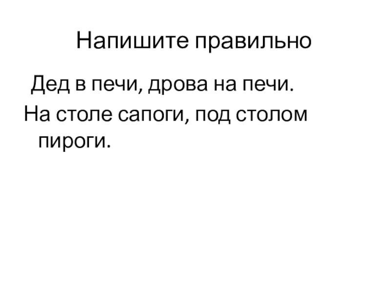 Напишите правильно Дед в печи, дрова на печи.На столе сапоги, под столом пироги.