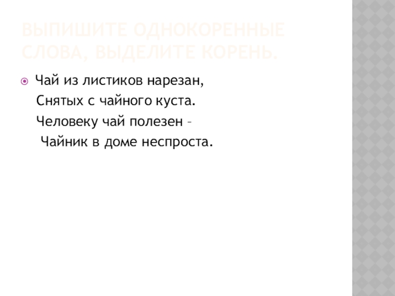 Слайд 5Выпишите однокоренные слова, выделите корень.