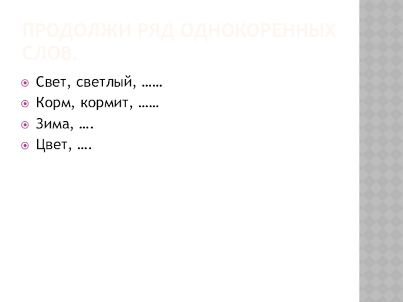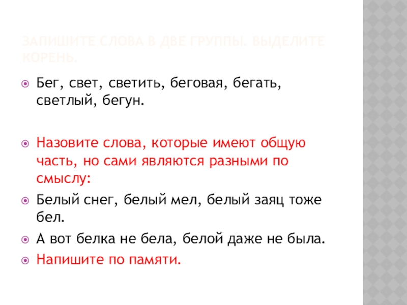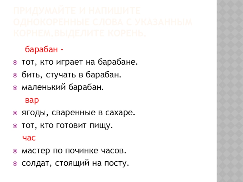Слайд 8придумайте и напишите однокоренные слова с указанным корнем.выделите корень.