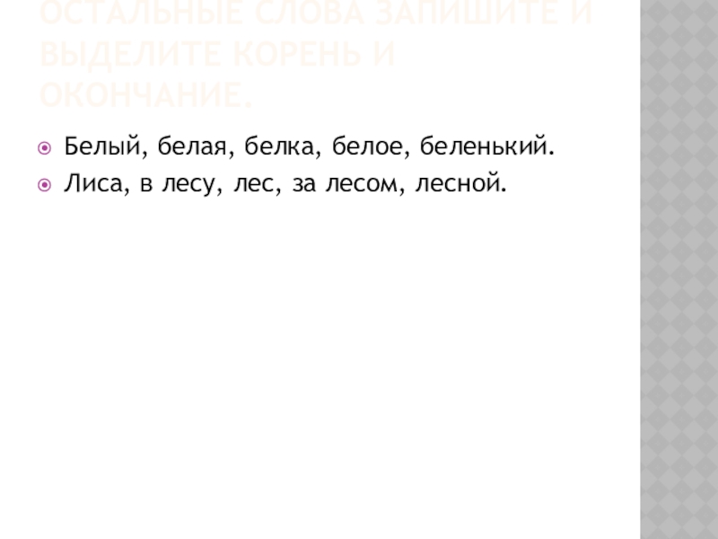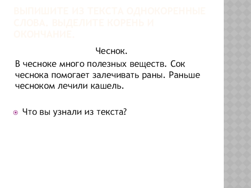 Слайд 12Выпишите из текста однокоренные слова. выделите корень и окончание.