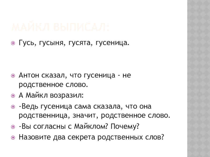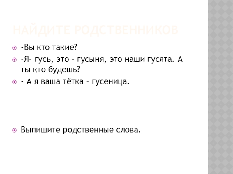 -Ведь гусеница сама сказала, что она родственница, значит, родственное слово.