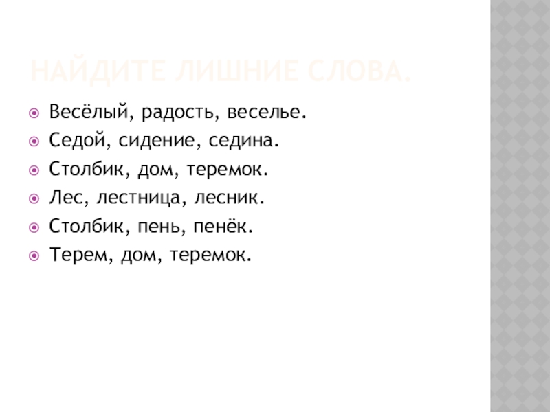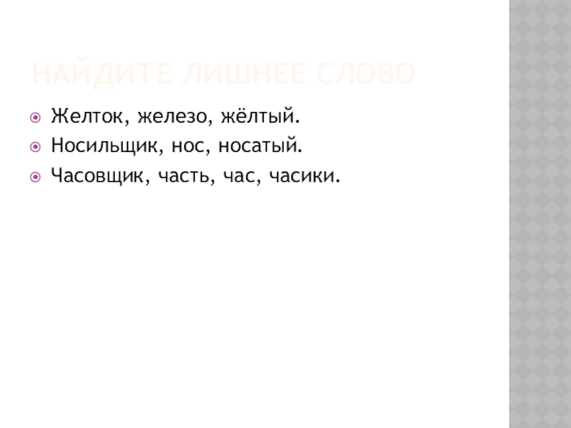 Слайд 10Найдите лишнее слово.остальные слова запишите и выделите корень и окончание.