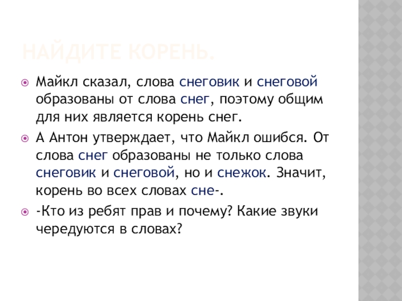 А Антон утверждает, что Майкл ошибся. От слова снег образованы не только слова снеговик и снеговой, но и снежок. Значит, корень во всех словах сне-.