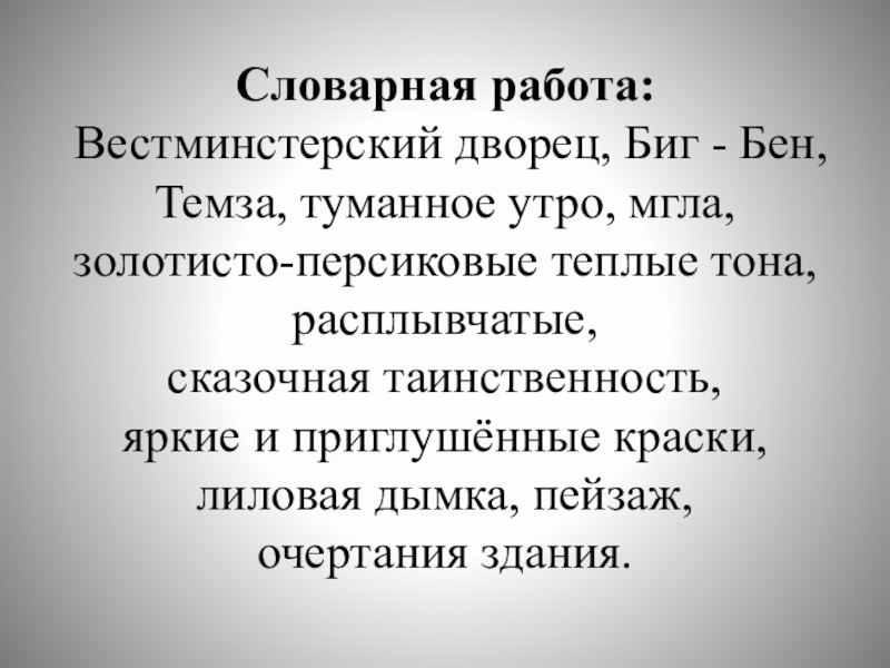 Слайд 7 Словарная работа: Вестминстерский дворец, Биг - Бен, Темза, туманное утро, мгла,