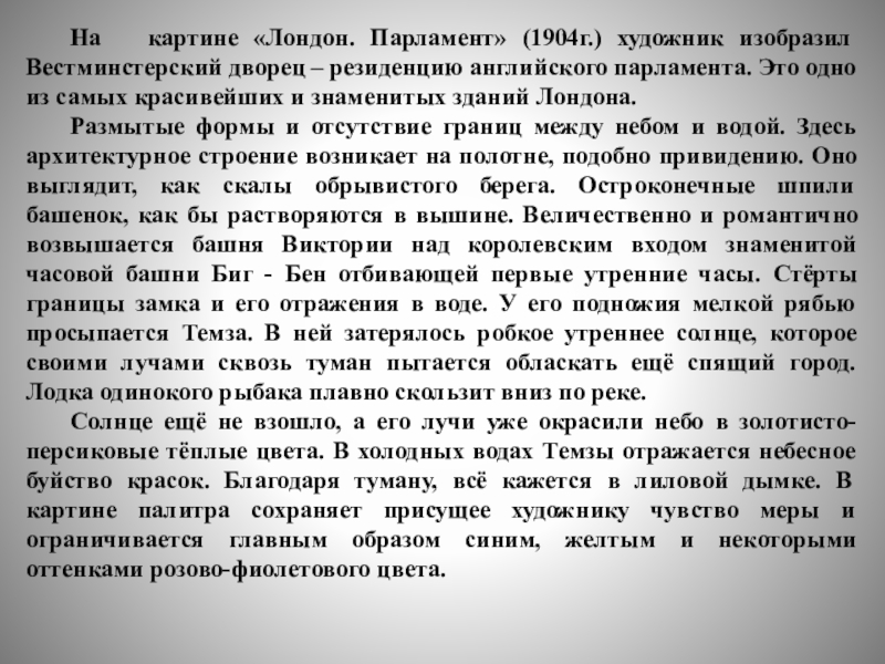 На  картине «Лондон. Парламент» (1904г.) художник изобразил Вестминстерский дворец – резиденцию английского парламента. Это одно из