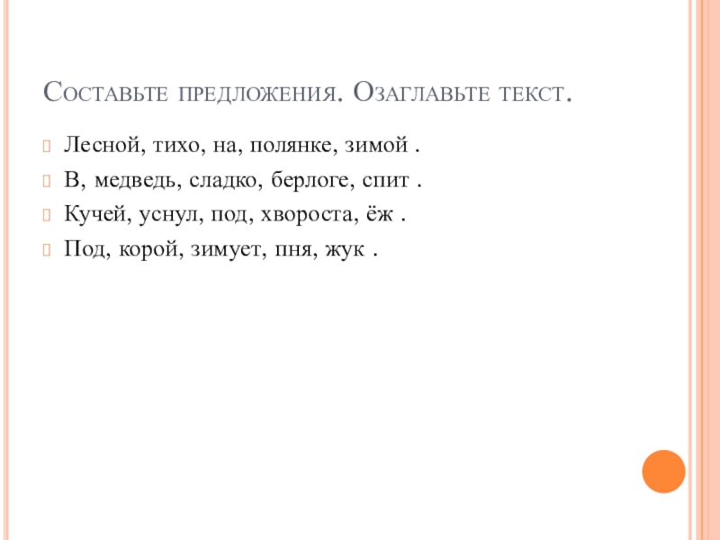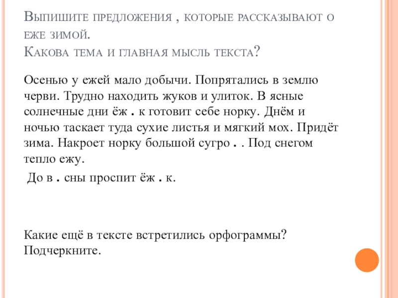 Осенью у ежей мало добычи. Попрятались в землю черви. Трудно находить жуков и улиток. В ясные солнечные дни ёж . к готовит себе норку. Днём и ночью таскает туда сухие листья и мягкий мох. Придёт зима. Накроет норку большой сугро . . Под снегом тепло ежу.