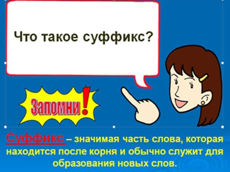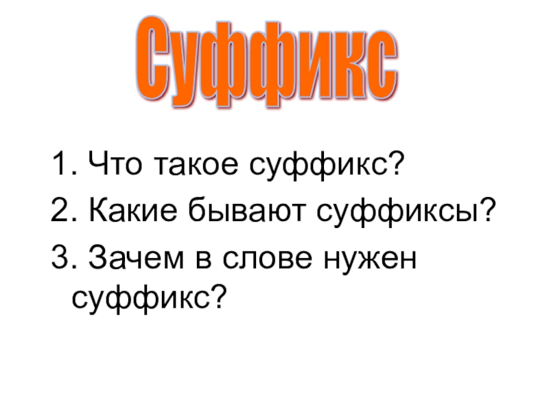 1. Что такое суффикс?2. Какие бывают суффиксы?3. Зачем в слове нужен суффикс?Суффикс