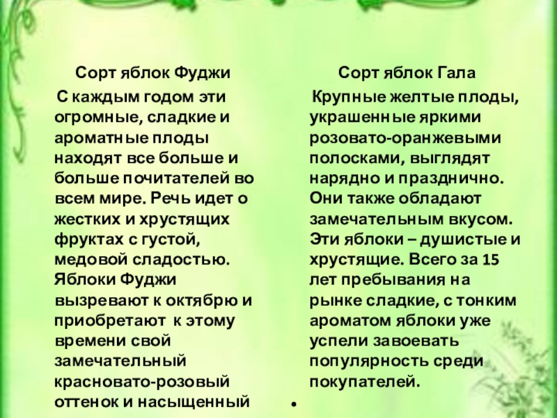 Крупные желтые плоды, украшенные яркими розовато-оранжевыми полосками, выглядят нарядно и празднично. Они также обладают замечательным вкусом. Эти яблоки – душистые и хрустящие. Всего за 15 лет пребывания на рынке сладкие, с тонким ароматом яблоки уже успели завоевать популярность среди покупателей.