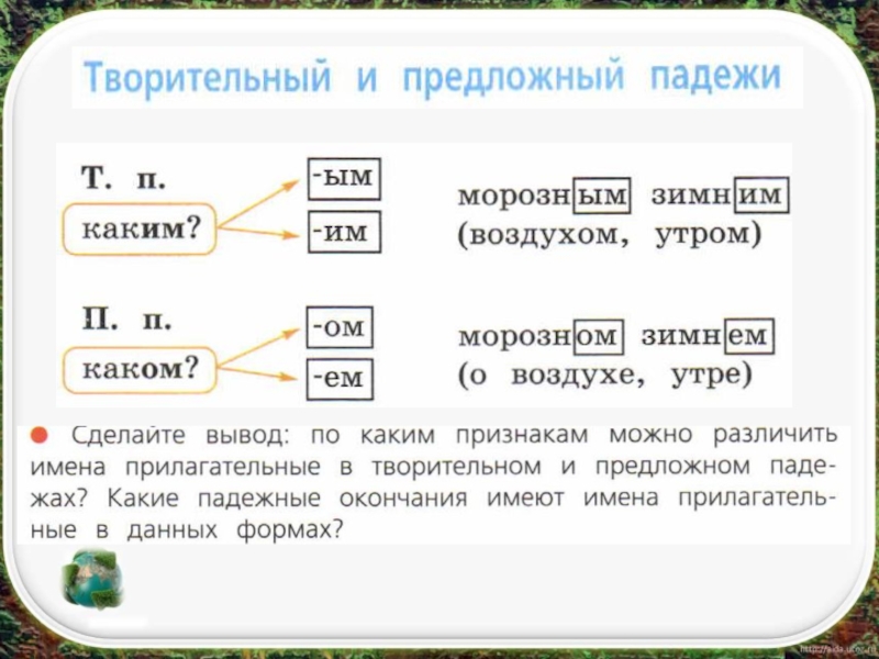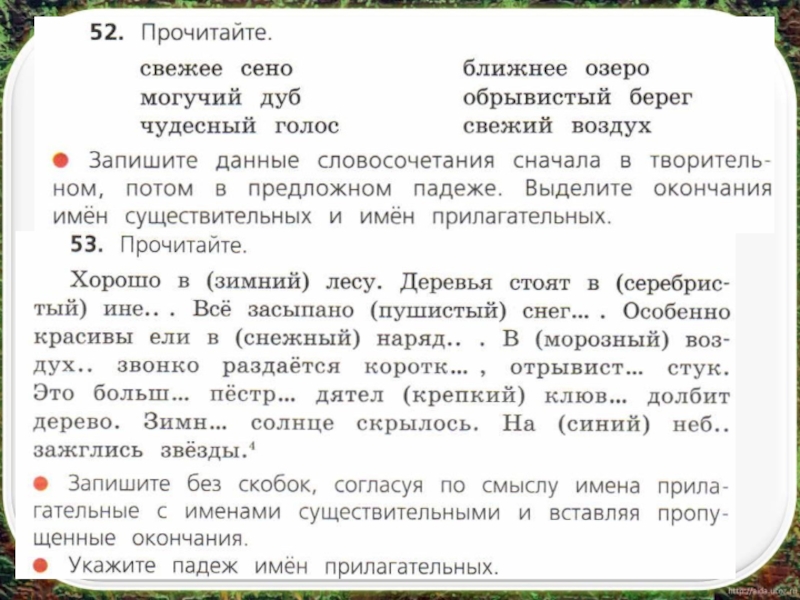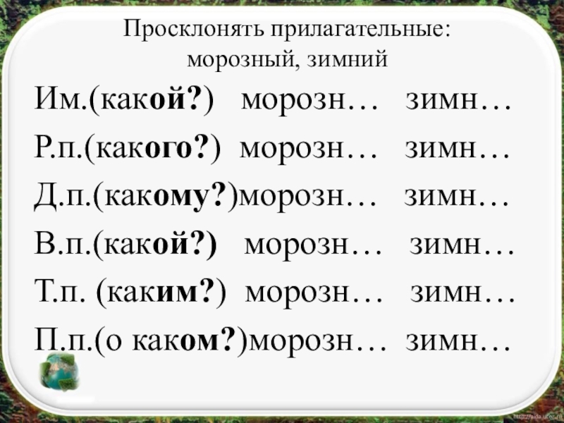 Просклонять прилагательные: морозный, зимнийИм.(какой?)  морозн…  зимн…Р.п.(какого?) морозн…  зимн…Д.п.(какому?)морозн…  зимн…В.п.(какой?)  морозн…  зимн…Т.п.