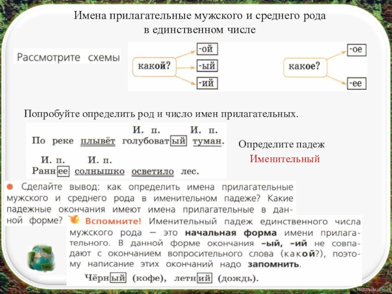 Имена прилагательные мужского и среднего рода в единственном числеПопробуйте определить род и число имен прилагательных.