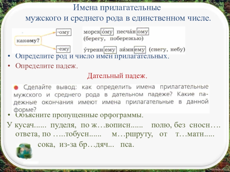Имена прилагательные  мужского и среднего рода в единственном числе.Определите род и число имен прилагательных.Определите падеж.Дательный падеж.