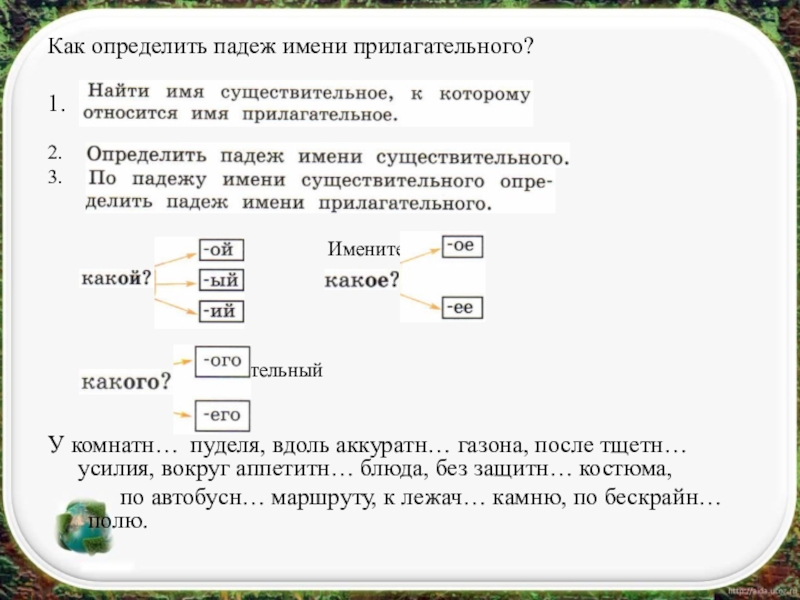Как определить падеж имени прилагательного?  1.   2.3.							Именительный				Родительный    У