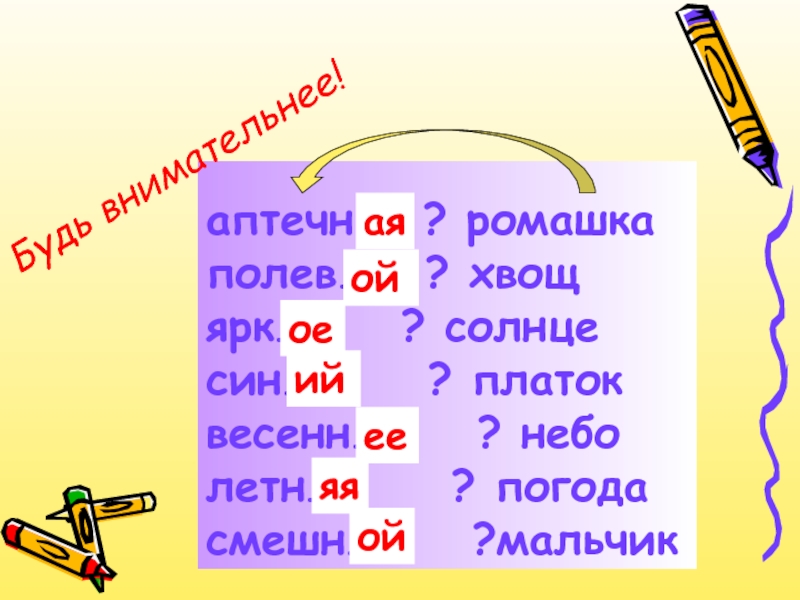 Тема: Правописание родовых окончаний имён прилагательных в единственном числе.Цель: Учиться правильно писать родовые окончания имён прилагательных в