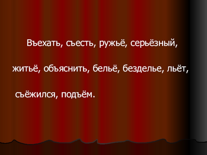 Въехать, съесть, ружьё, серьёзный, житьё, объяснить, бельё, безделье, льёт, съёжился, подъём.