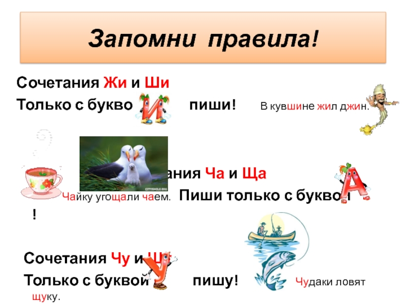 Запомни правила! Сочетания Жи и ШиТолько с буквой пиши! В кувшине жил джин. Сочетания Ча и Ща Чайку угощали чаем. Пиши только с буквой ! Сочетания Чу