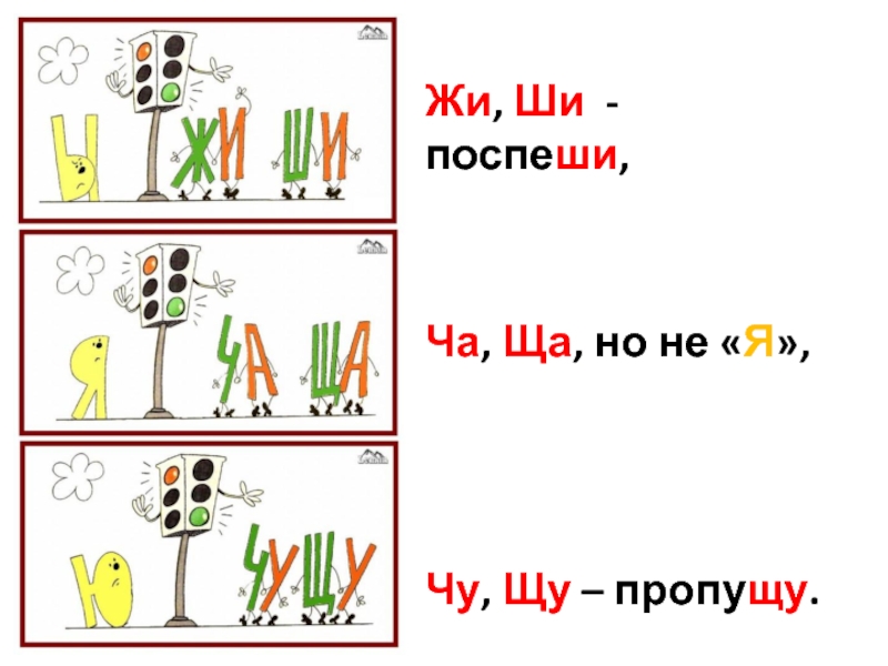 Жи, Ши - поспеши,Ча, Ща, но не «Я»,Чу, Щу – пропущу.