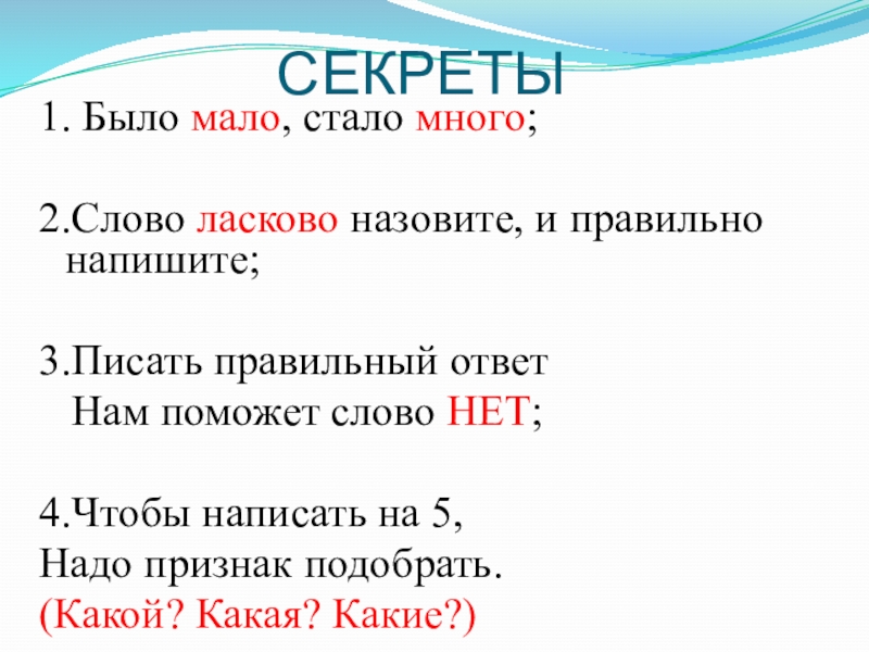 СЕКРЕТЫ1. Было мало, стало много;2.Слово ласково назовите, и правильно напишите;3.Писать правильный ответ  Нам поможет слово НЕТ;4.Чтобы