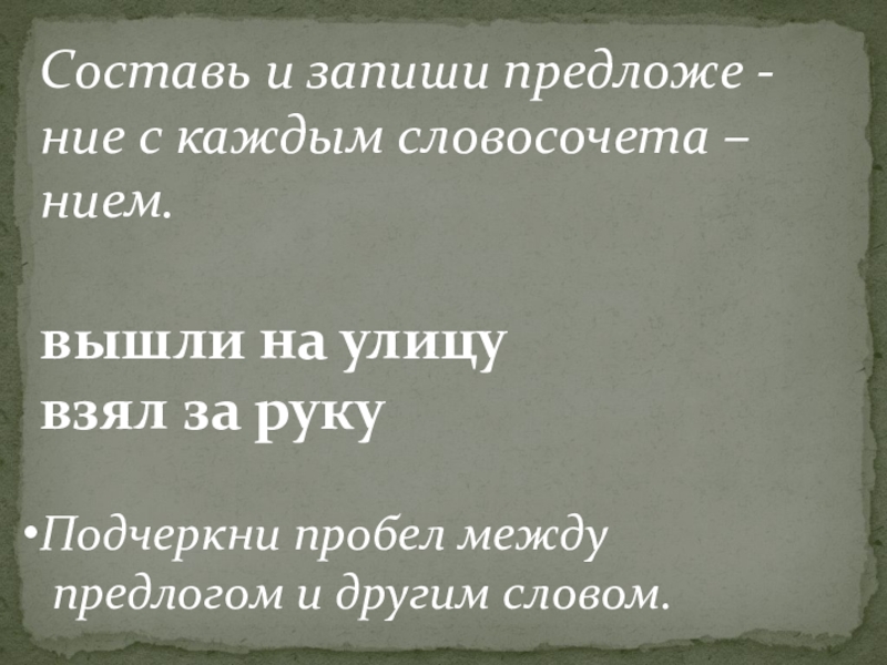 Составь и запиши предложе -ние с каждым словосочета –нием.вышли на улицувзял за рукуПодчеркни пробел между предлогом и