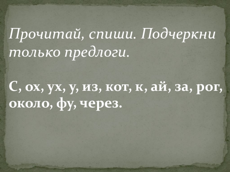 Прочитай, спиши. Подчеркни только предлоги.С, ох, ух, у, из, кот, к, ай, за, рог,около, фу, через.
