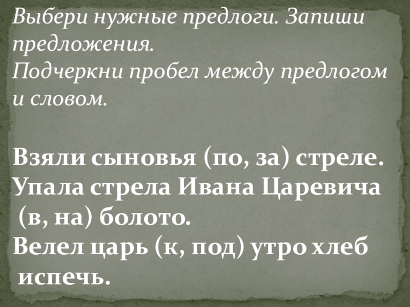 Выбери нужные предлоги. Запиши предложения.Подчеркни пробел между предлогом и словом.Взяли сыновья (по, за) стреле.Упала стрела Ивана Царевича