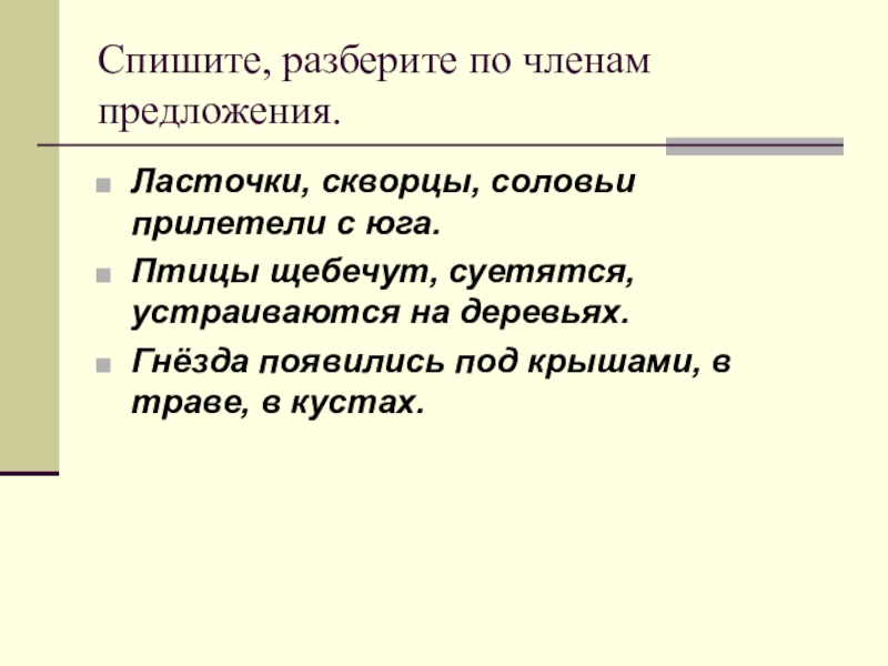 Спишите, разберите по членам предложения.Ласточки, скворцы, соловьи прилетели с юга.Птицы щебечут, суетятся, устраиваются на деревьях.Гнёзда появились под