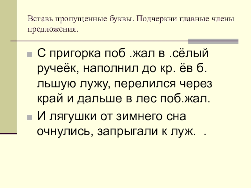 Вставь пропущенные буквы. Подчеркни главные члены предложения.С пригорка поб .жал в .сёлый ручеёк, наполнил до кр. ёв