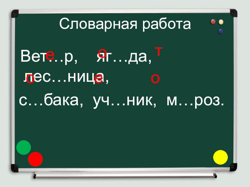 Словарная работа  Вет…р,  яг…да, лес…ница, с…бака, уч…ник, м…роз.  еотоео