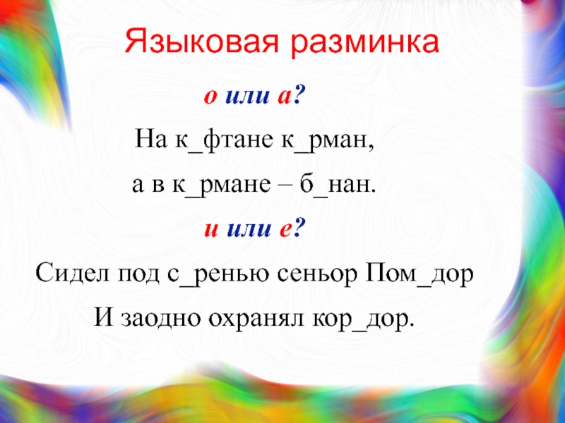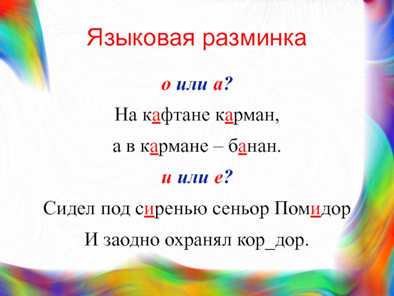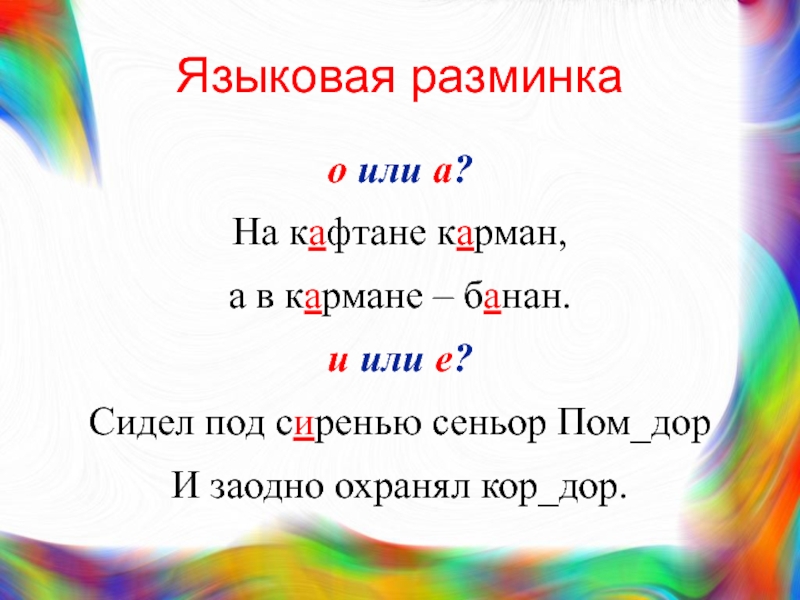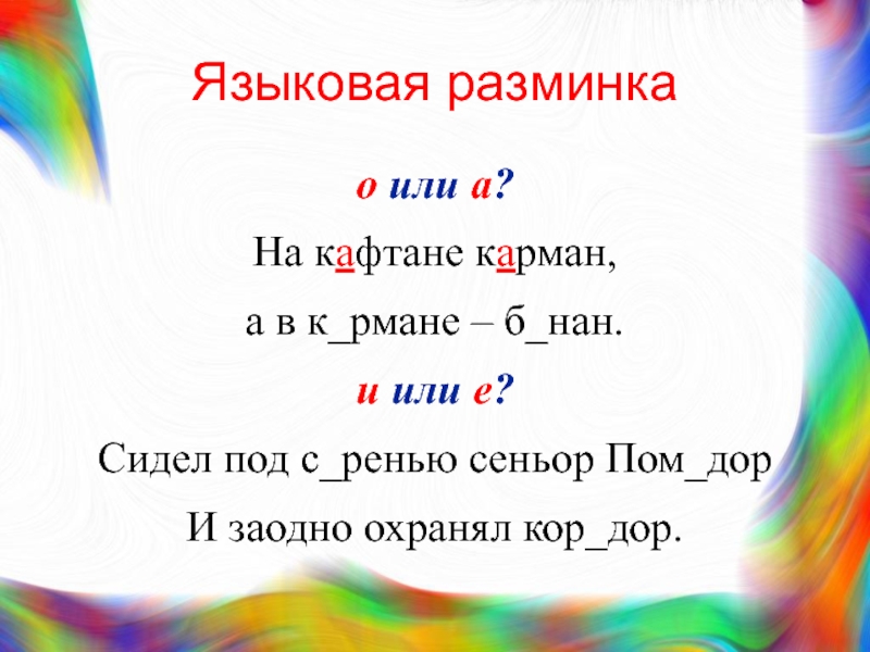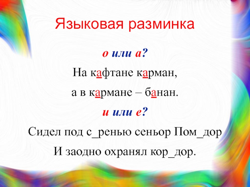 Языковая разминкао или а?На кафтане карман, а в к_рмане – б_нан.и или е?Сидел под с_ренью сеньор Пом_дорИ