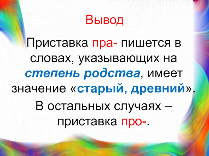 ВыводПриставка пра- пишется в словах, указывающих на степень родства, имеет значение «старый, древний». В остальных случаях –