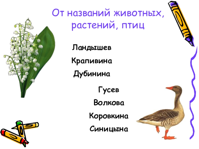 От названий животных, растений, птицЛандышевКрапивинаДубининаГусевВолковаКоровкинаСиницына
