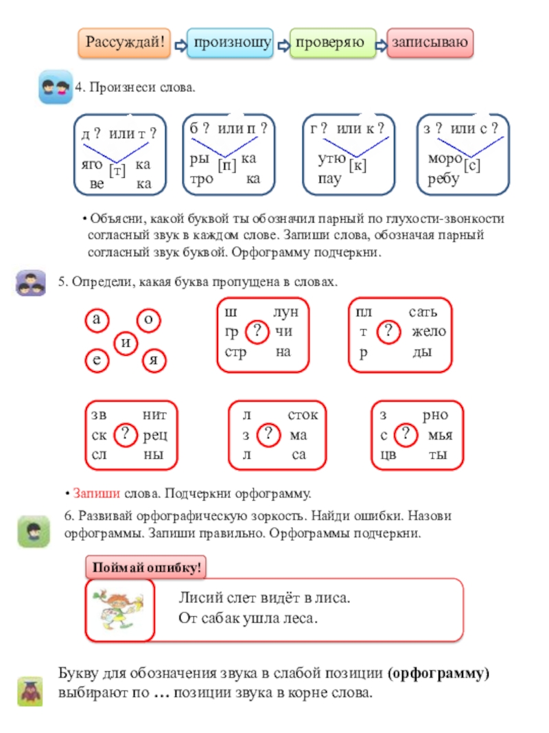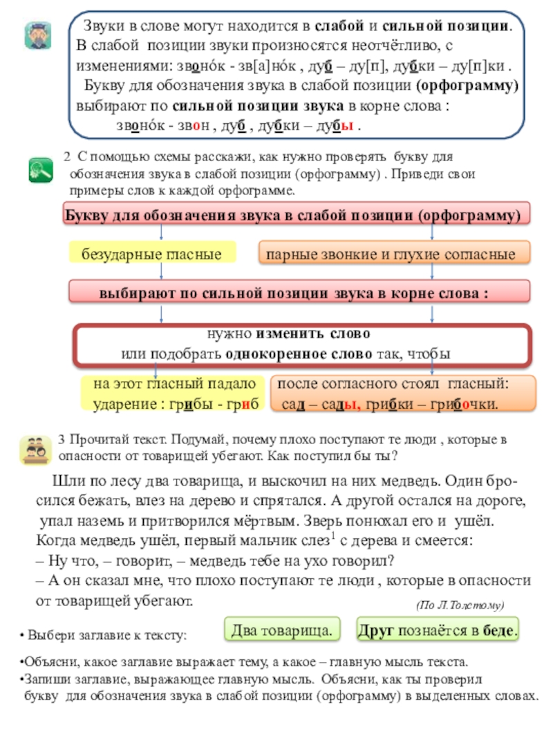как выбрать букву для обозначения звука в слабой позиции (орфограмму) в словах безударными гласными, парными звонкими и глухими согласными в корне.
