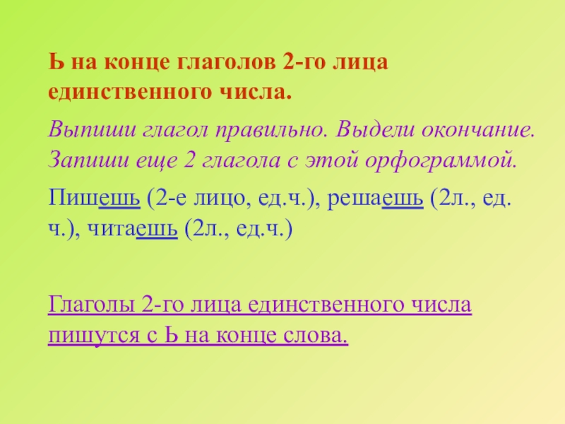 Слайд 16Ь на конце глаголов 2-го лица единственного числа.