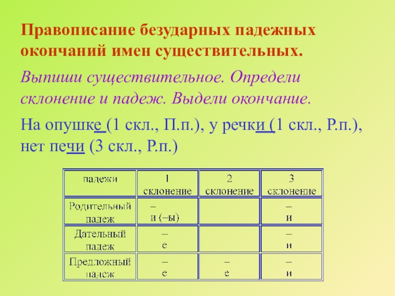Слайд 14Правописание безударных падежных окончаний имен существительных.